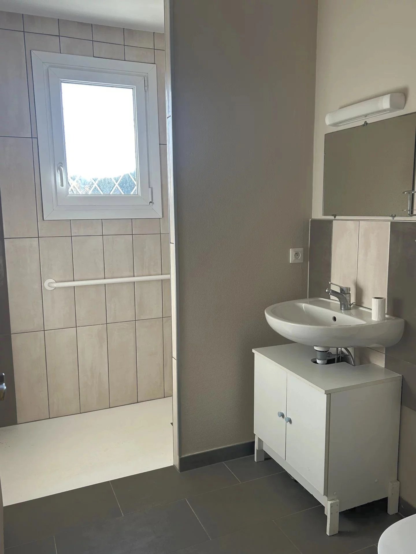 Salle d'eau rénovée avec bac de douche à l'italienne.